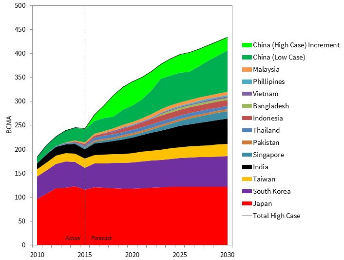 Across 2016 and 2017, Asia looked to be on a high demand growth trajectory, led by China. Asian demand was absorbing new liquefaction output as well as pulling flexible LNG supply from Europe (particularly across winter).