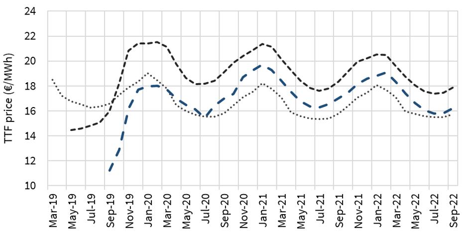 LNG that is surplus to Asian, Latam & MENA requirements, is absorbed by Europe’s liquid & price responsive gas hubs. As we set out in July, the growing surplus of LNG flowing into Europe in 2019 is having a ‘snowplough’ effect on the TTF forward curve as shown in Chart 2.