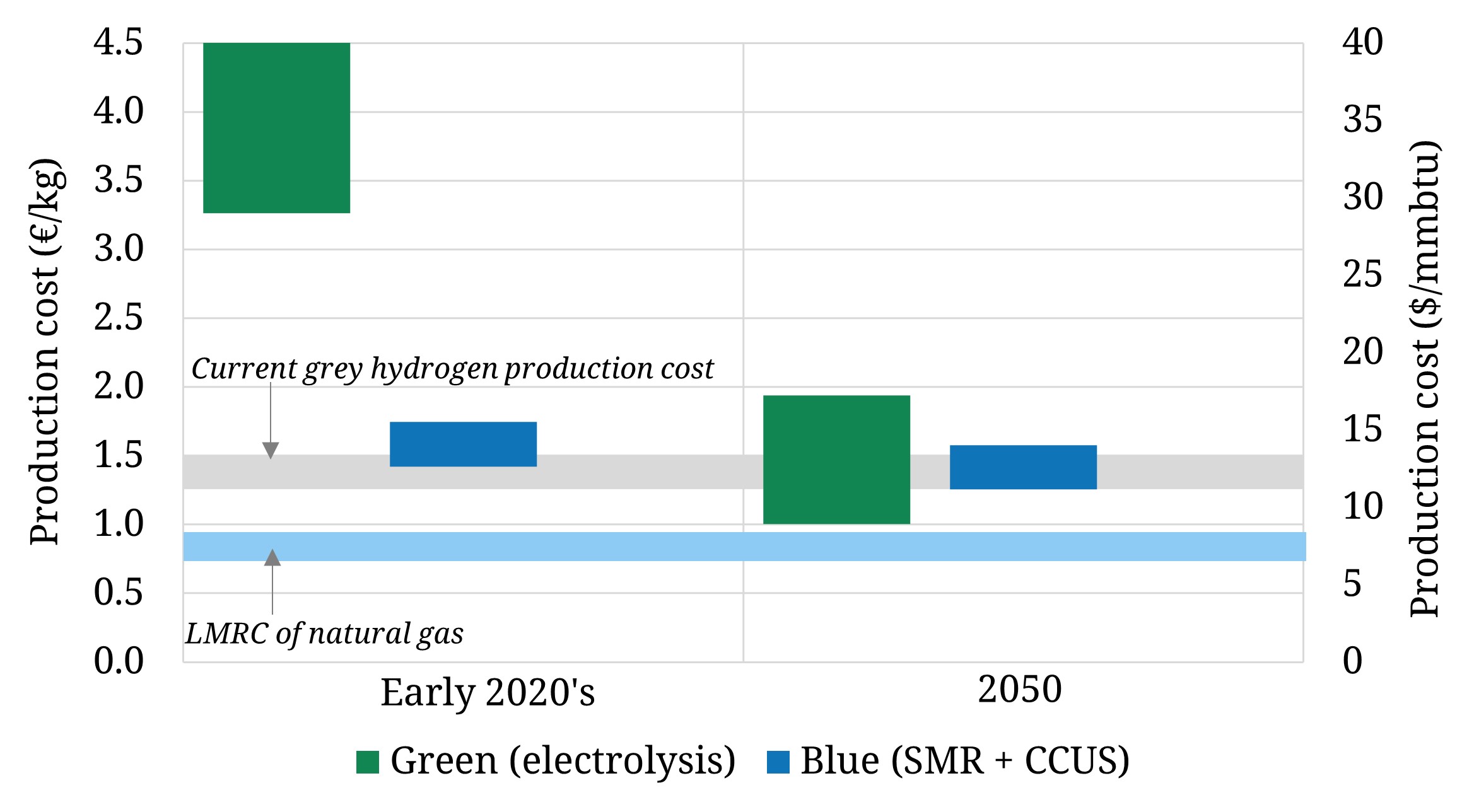 Chart 1: Green & blue hydrogen cost ranges versus current alternatives