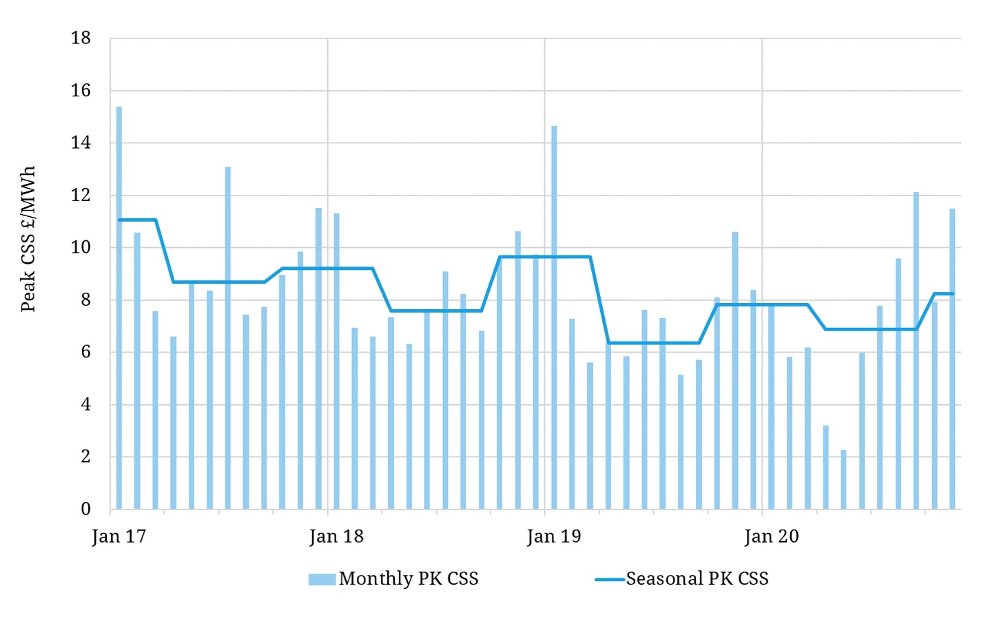 Over the past 4 years, average Peak CSS has fallen from a winter high of over £11/MWh in Q1 2017, to a low of around £8/MWh in Winter 2019.  This reflects the impact of consecutive warm winters, increasing renewable output and rising imports, reducing the requirement for gas-fired generation.