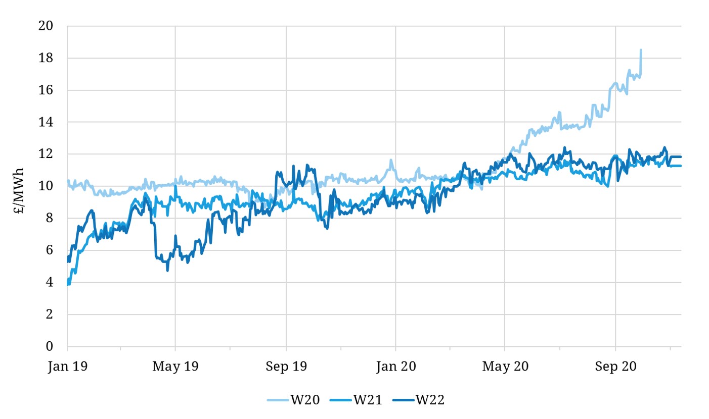 Beyond the nuclear issues of 2020, the Winter 2021 and 2022 forward Peak CSS have also been rising steadily, up by almost 50% since the start of the year (from around 8 to 12 £/MWh). This reflects a tightening UK market balance as nuclear and coal plants close.
