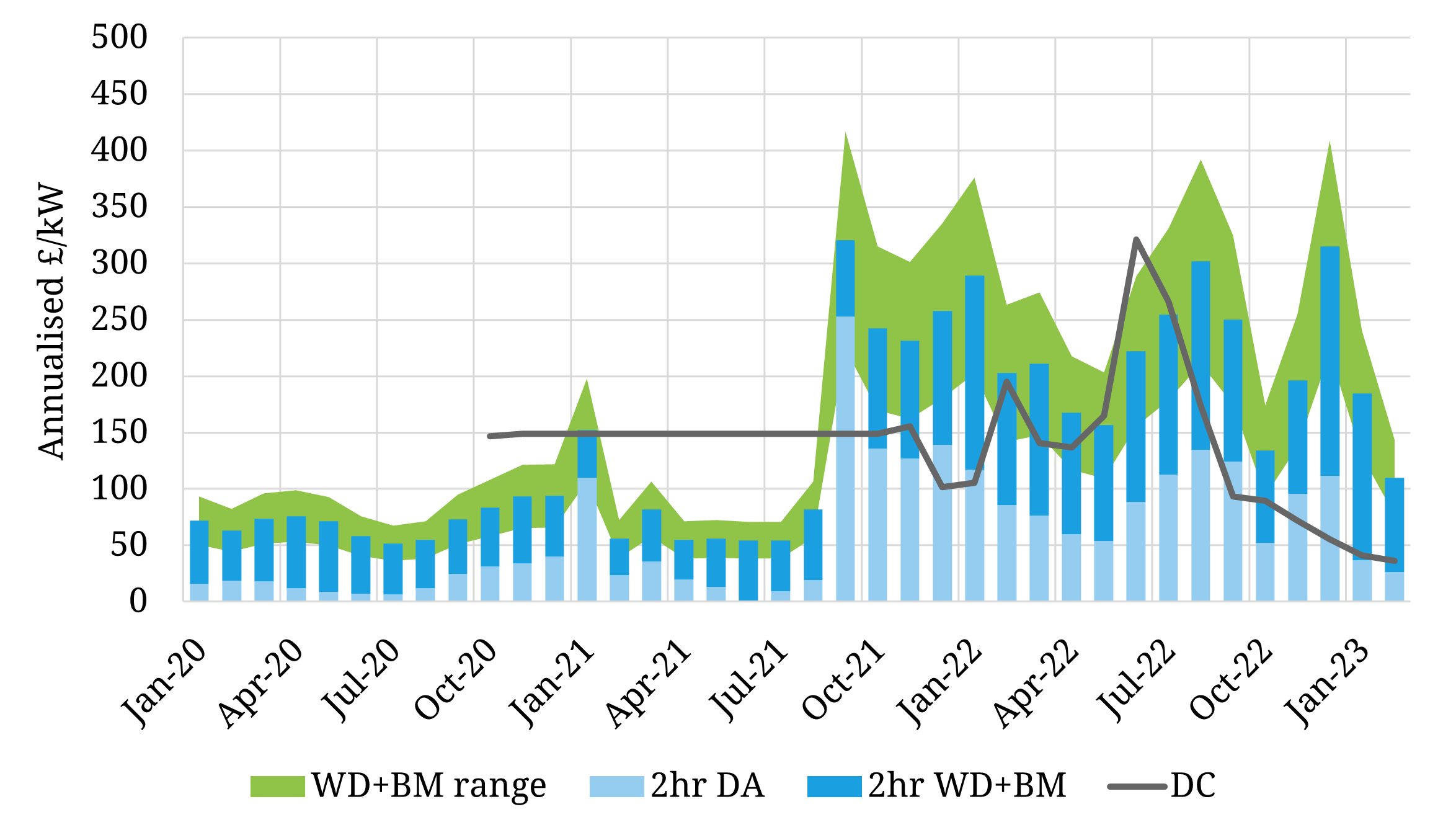 Batteries in the GB market have captured extraordinary returns across 2021 and 2022. For example 2-hr batteries have been able to earn over 200 £/kW/yr, more than double the required return on investment. The BESS revenue stack has been underpinned by strength across both ancillary service and energy arbitrage returns.
