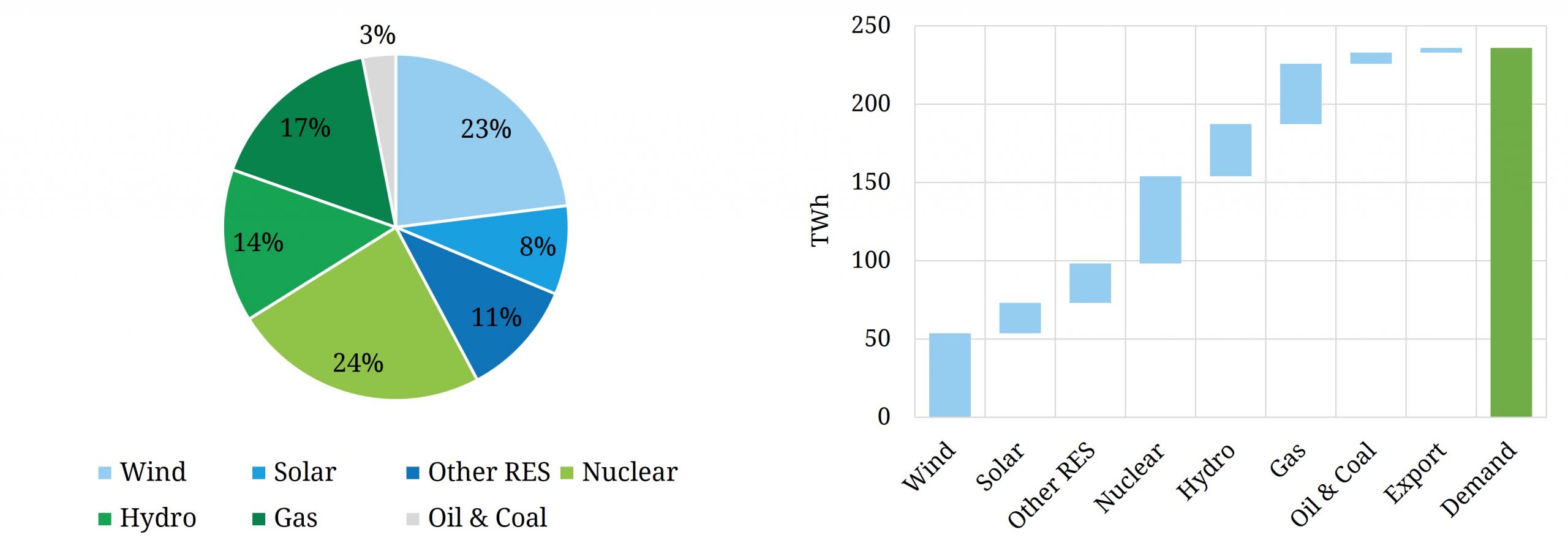 Gas, hydro and remaining coal capacity dominate price setting. Hydro generation plays an important role in Spain, both from an energy & flexibility provision perspective. Hydro output can vary significantly from year to year depending on rainfall (e.g. 15-40 TWh range). Spain also has 8GW of pump storage capacity which plays an important longer duration storage role.
