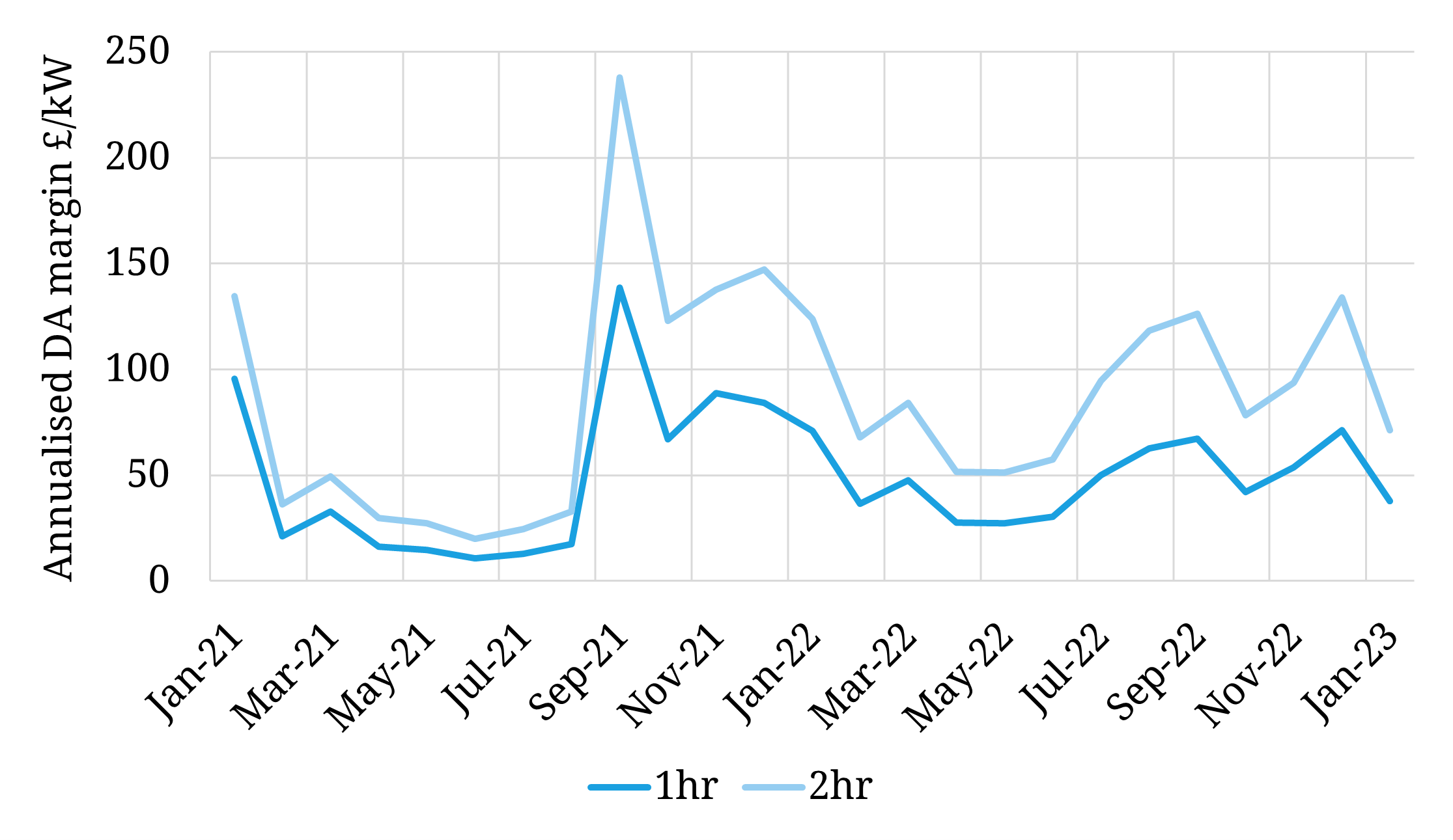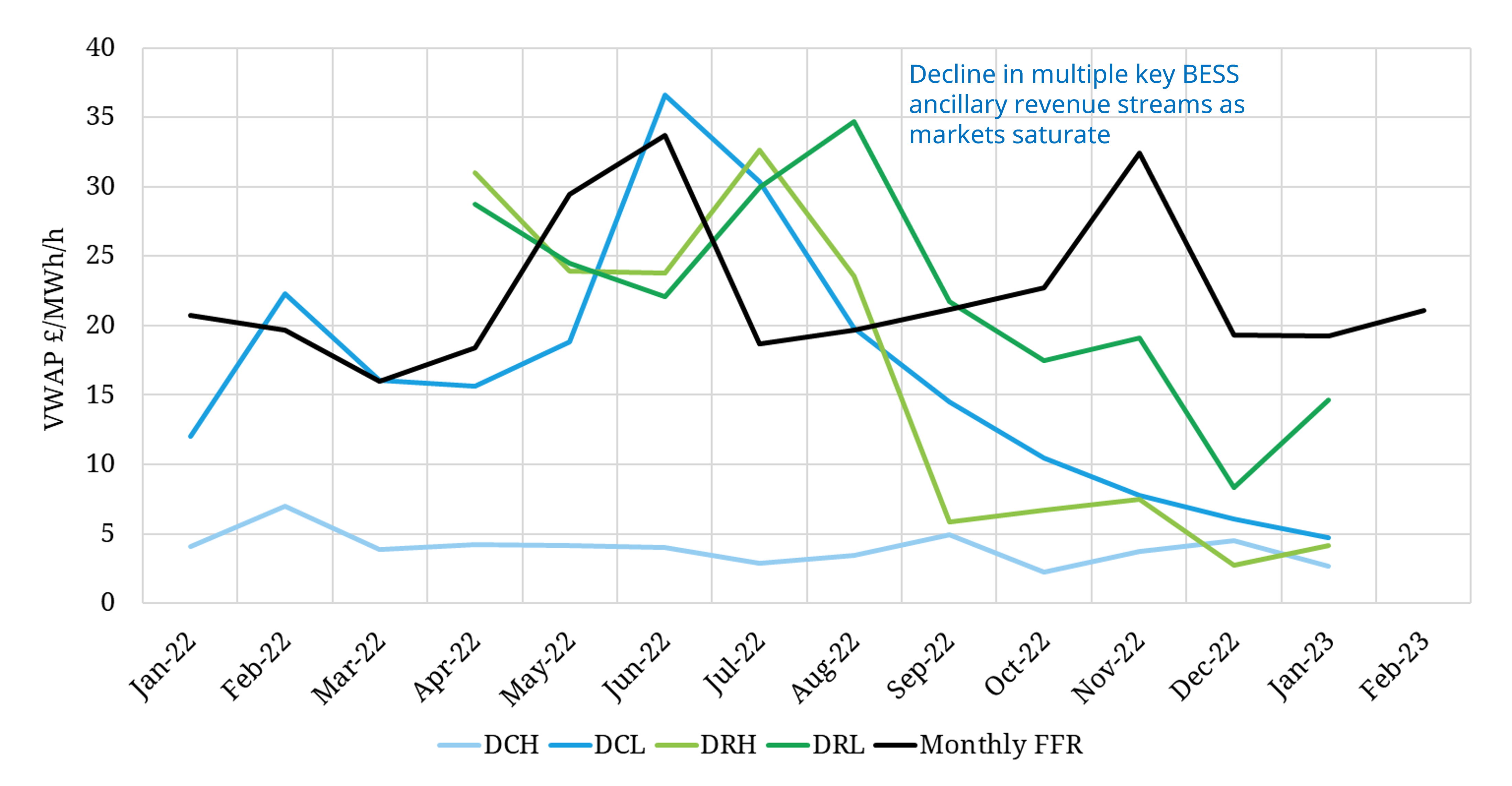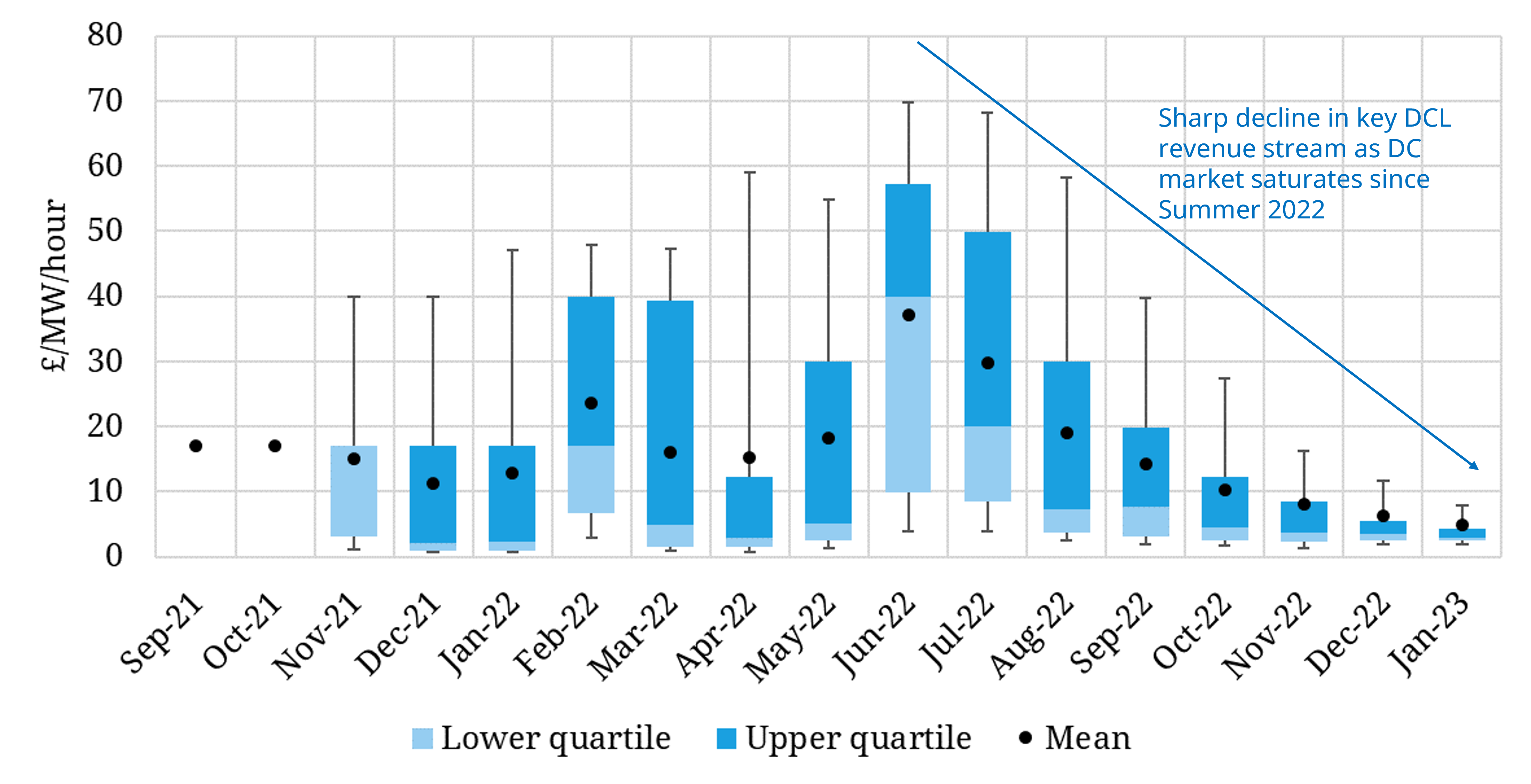Revenues from the key DCL service have fallen from above 15.0 £/MW/h (150 £/kW/yr equivalent) across summer 2022 to 4.5-5.0 £/MW/h (50-60 £/kW/yr) across recent weeks.