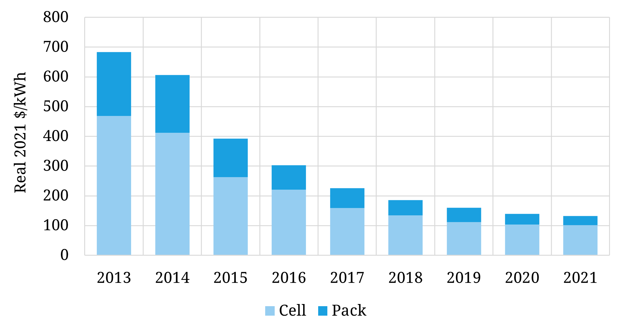 Cell and pack costs are projected to decline below 100 $/kWh by the mid-2020s (at least in real 2021 terms). Cost declines are likely to support the further lengthening of battery project duration.