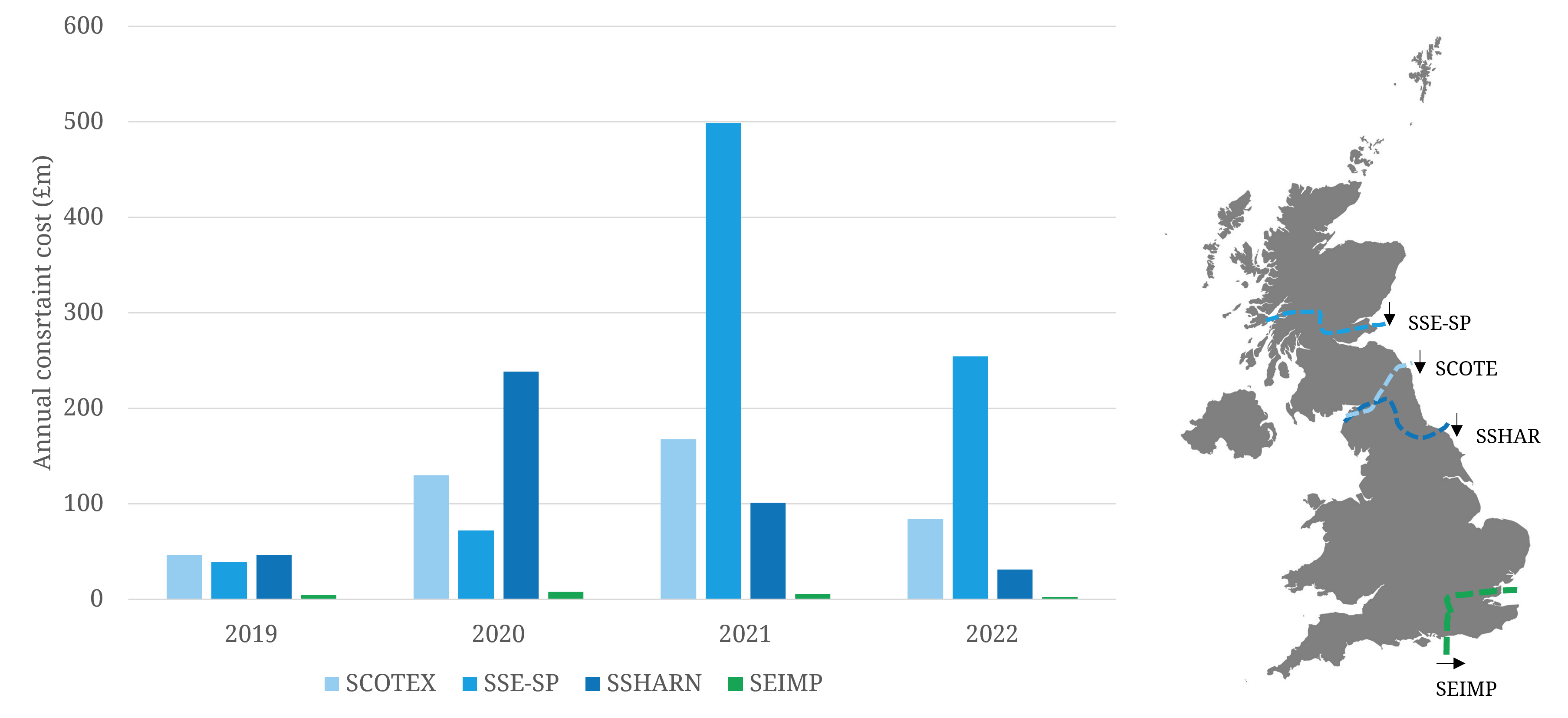 Chart 1 shows a map marked with the key constraint boundaries and the costs of managing these constraints across the last few years.