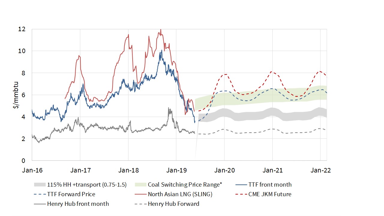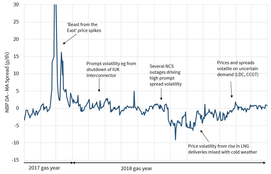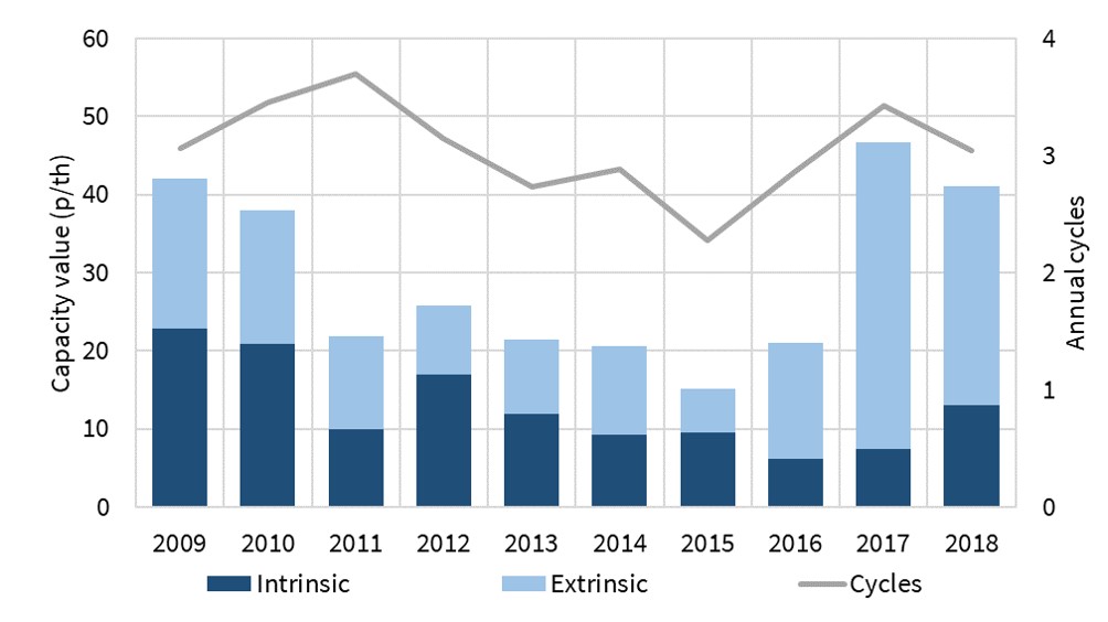 The other important dynamic that impacts thermal asset load factors is relative commodity price levels. The overhang of capacity and falling demand, pushed CCGTs into a peaking flex provision role by the middle of this decade. But CCGT load factors have started to rise again across 2018-19, as falling gas prices and rising carbon costs erode coal plant competitiveness.