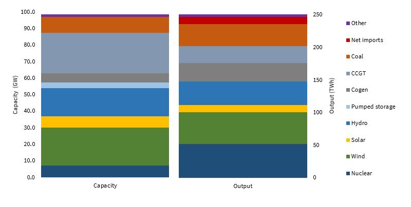 Chart 1: Spanish generation capacity (GW) & production output (TWh)