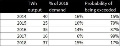 In a dry year (e.g. 2016), Spanish hydro accounts for around 6% of demand. In a wet year that can rise above 15%. The right hand column gives an indication of the probability of exceeding the level of hydro output in each year (low % if a wet year, high % if a dry year). Swings in hydro output are an important driver of gas and coal plant load factors (which rise in dry years).