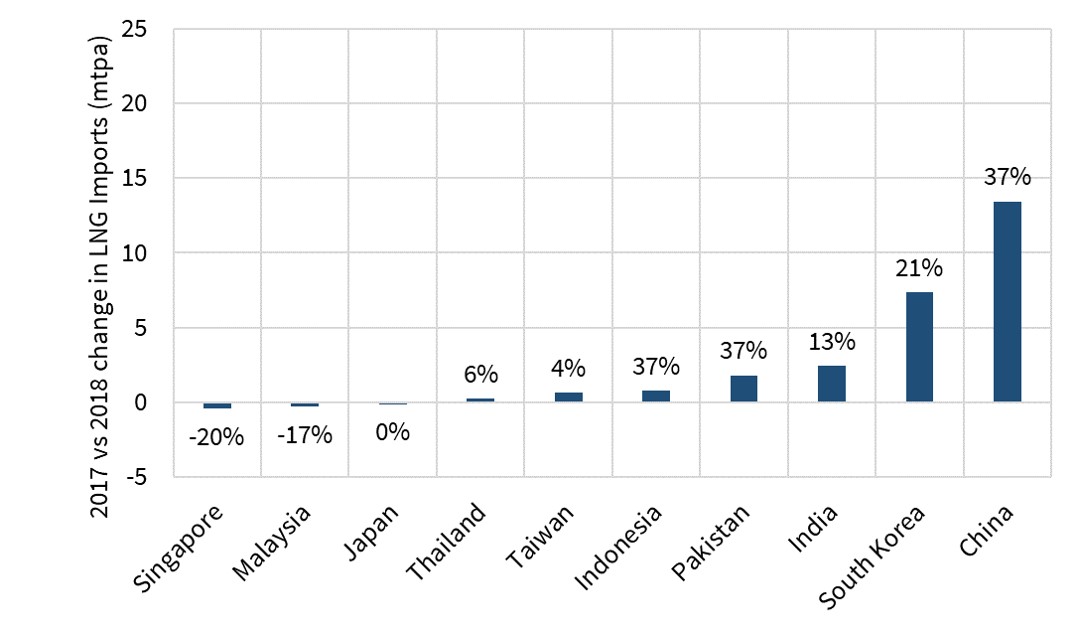 South Korea had a 7.5 mtpa (10.1 bcma) increase in demand (21% higher than 2017), driven by a surge in LNG demand for the power sector given a series of nuclear shutdowns (as we covered in our recent Snapshot piece).
