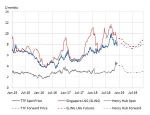 Then as winter commenced, a surge of surplus cargoes flowed back into European hubs across Q4. Spot prices in Asia and Europe fell in sympathy, reconverging near 8 $/mmbtu by year end (see our 2018 surprises article for a chart and more details).