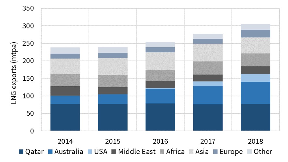 - Australia: doubling exports since 2015 to 64.6 mtpa (87.8 bcma) in 2018, with more to come this year