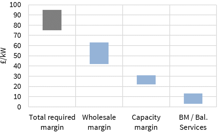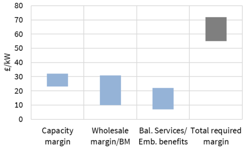 Chart 1 illustrates margin ranges for a generic new UK CCGT. The left hand column represents total asset margin required to earn a reasonable return on capital (i.e. a higher single digit unlevered IRR).