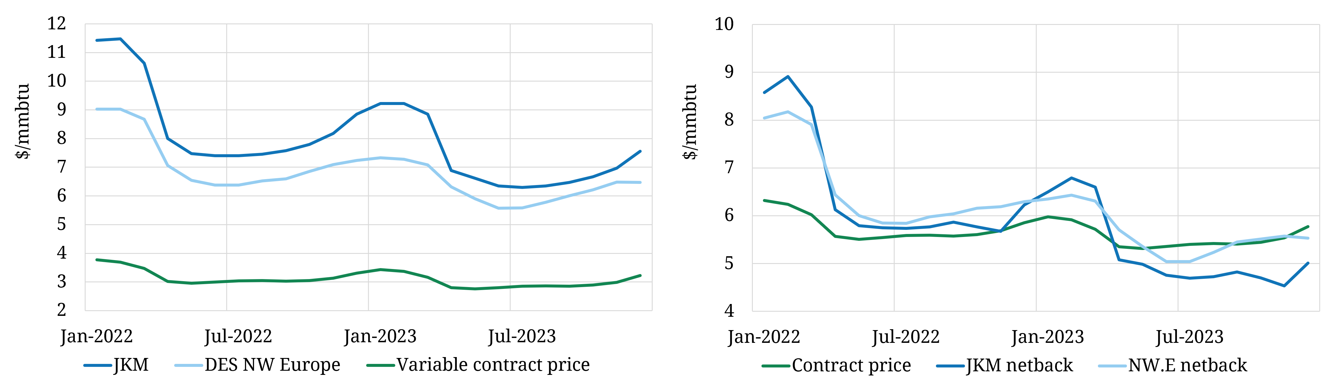 The left hand panel of Chart 1 shows the US variable contract price (in green) compared to the raw forward prices for selling LNG in Asia (JKM) and Europe (DES Nth West Europe). The right hand panel shows how these prices compare on a netback basis to the full contract price i.e. accounting for transport costs from the US Gulf Coast.