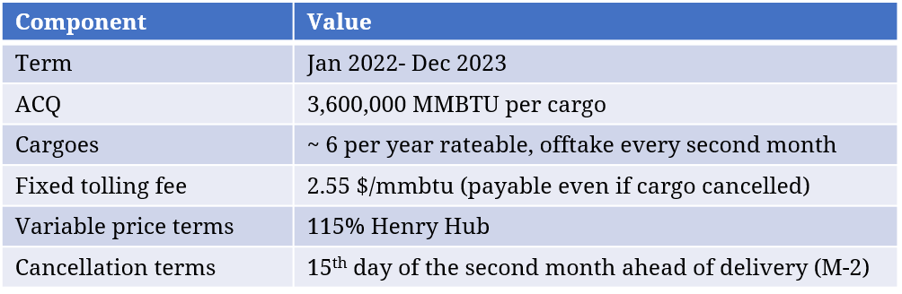 We base our case study around a relatively standard US export terminal tolling structure, over a shorter two year time period (to allow us to focus in on value dynamics). The main contract terms are summarised in Table 1 below, with the contract having a fixed tolling fee and variable cost of exported gas linked to Henry Hub. Cargo cancellation is possible (if US Gulf Coast netback prices fall below the variable price as occurred in 2020).