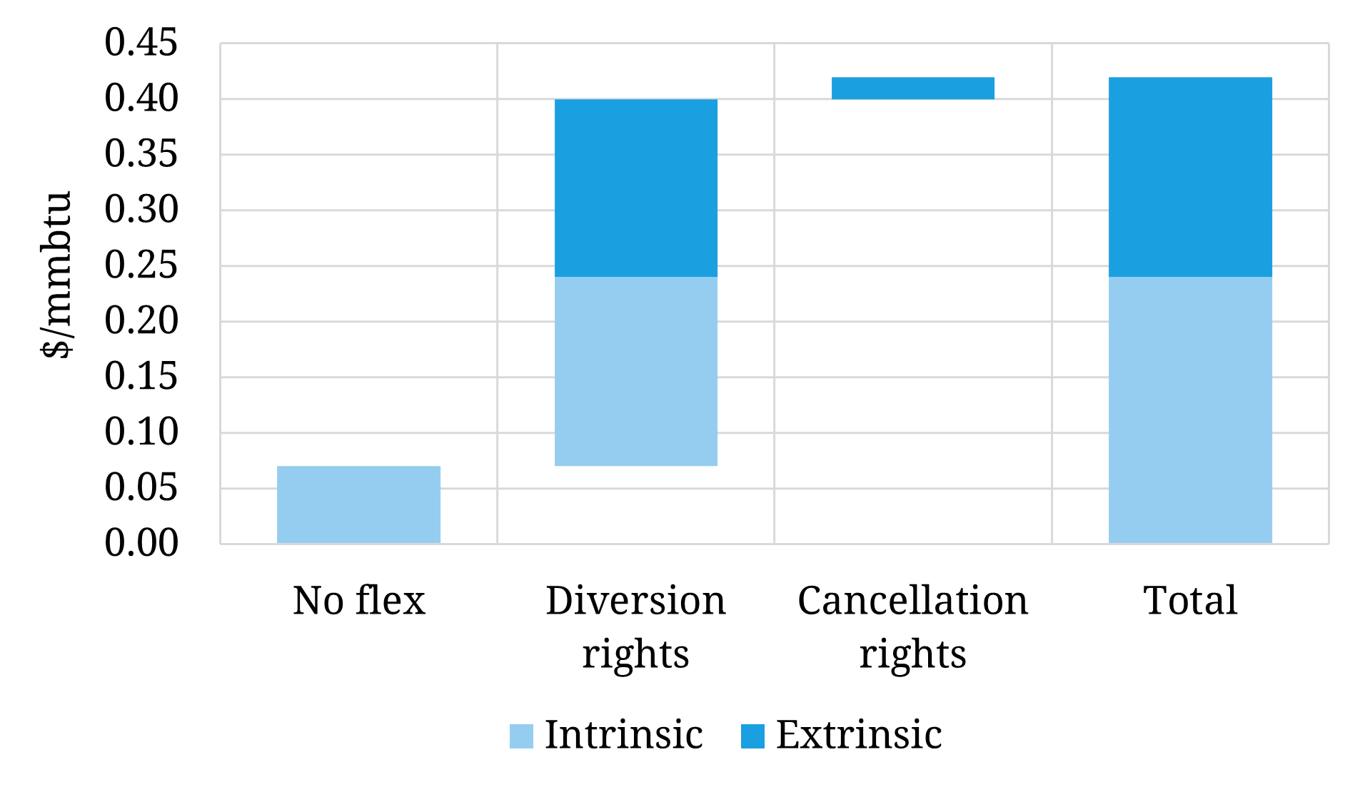 The chart shows the contract is ‘in the money’ by 0.07 $/mmbtu on a ‘No flex’ intrinsic basis i.e. delivering all cargos into Asia. Note this value includes the 2.25 $/mmbtu fixed tolling fee (from Table 1).