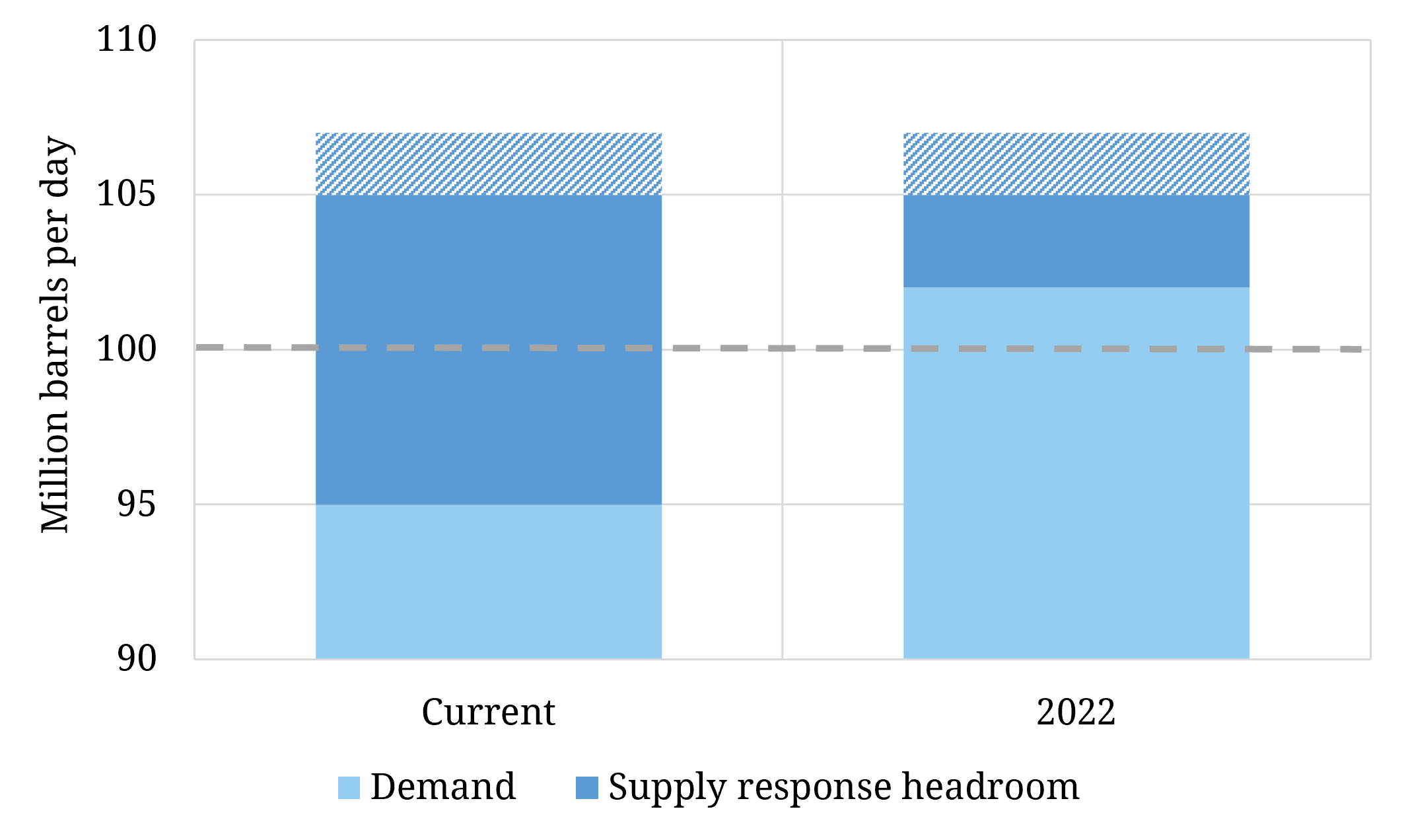 At the point production headroom is absorbed, the oil market supply curve becomes pretty inelastic (unresponsive to price), with demand destruction the main short term mechanism to balance the market. That could mean much higher spot crude prices.