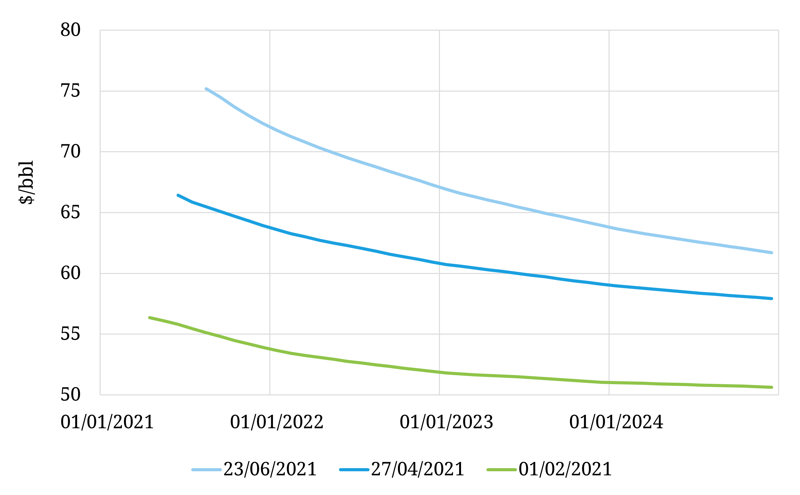 For the last decade, longer dated crude prices (e.g. 3 – 5 years forward) have been anchored by US shale production cost dynamics. Pre-Covid crash, this anchor was around a 55-60 $/bbl range for Brent (see our Brent curve animation here for a clear visual).