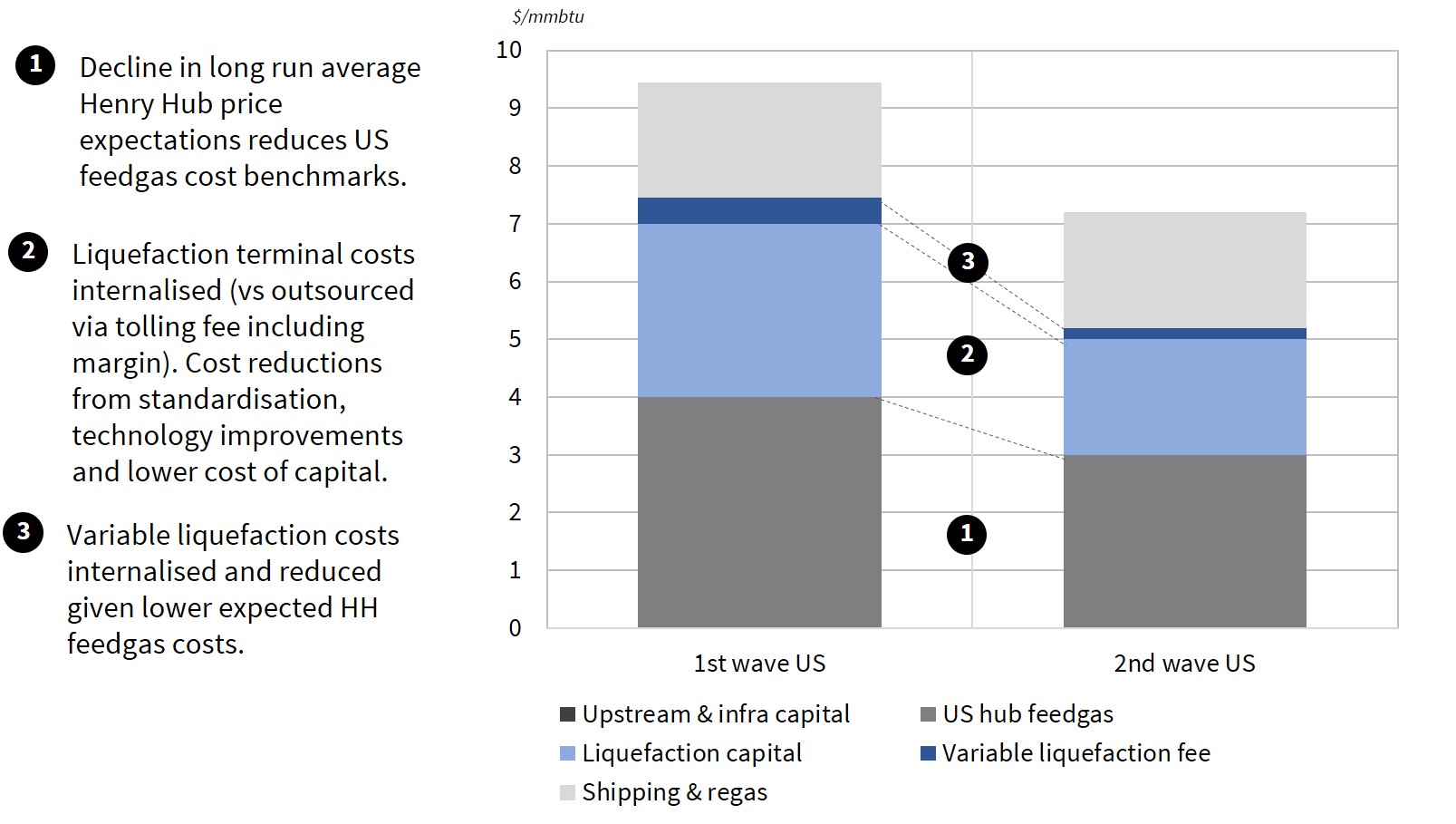 Cost & exposure internalisation means that 2nd wave FID decisions are likely to be based on equity investor’s expectations of market prices (US hub and LNG spot prices) and project costs, rather than depending on the external pricing of tolling contracts and non-recourse debt.