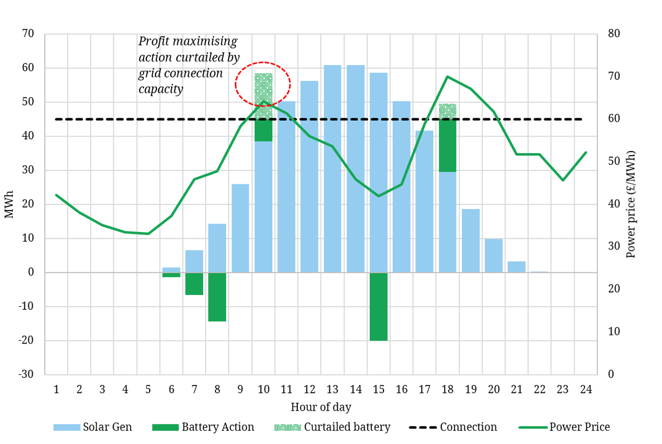 Despite sharing a grid connection, co-located assets should be optimised independently, rather than as a single unit. Solar generation typically has priority over the battery dispatch, with the battery operating around the solar generation profile. Average UK solar load factors are around 12%, leaving up to 88% of unutilised export capacity.