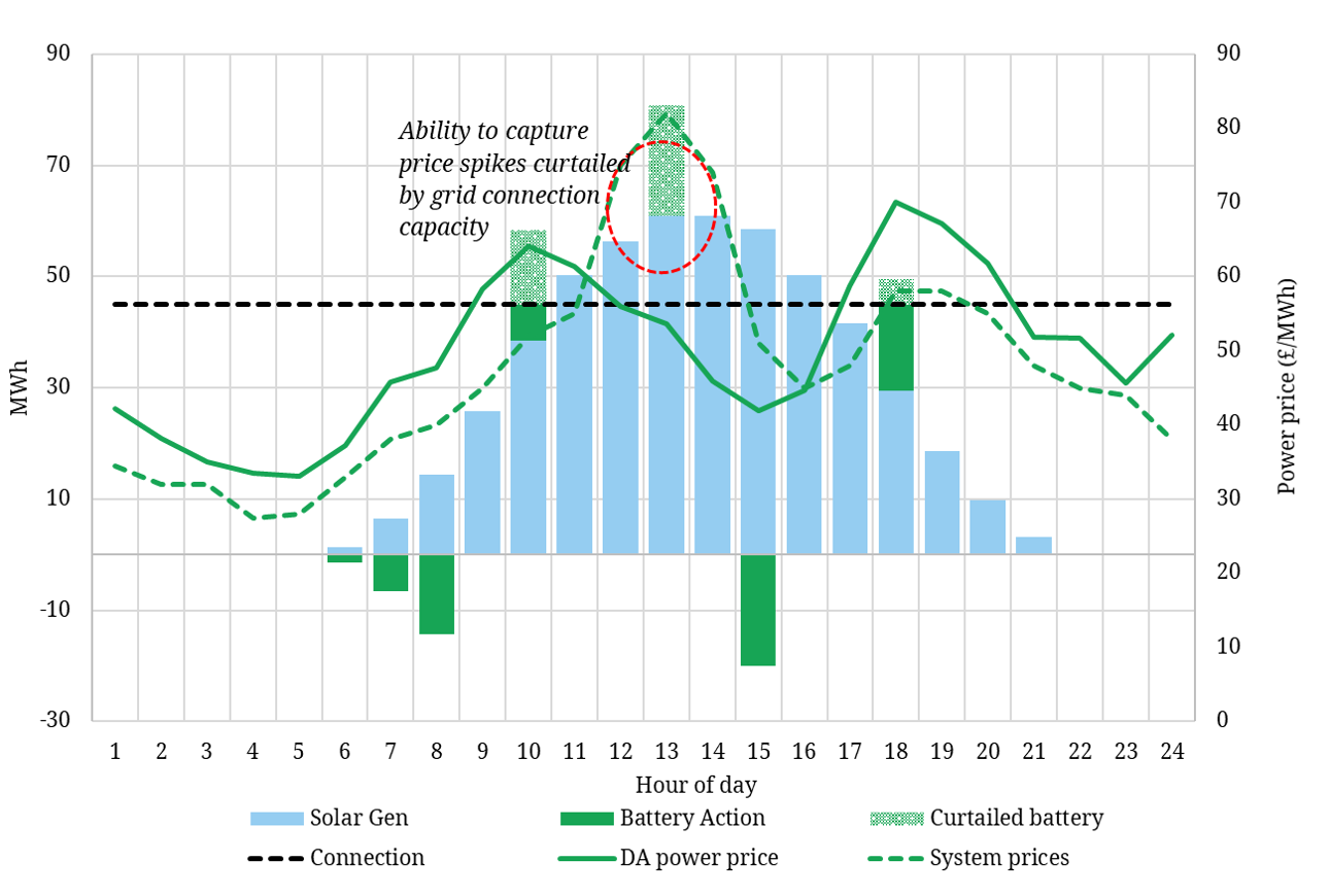 In Chart 2, the system goes short across the middle of the day, leading to a spike in system prices. A stand-alone battery (with its own connection) would be well placed to capture this, but the co-located battery is curtailed by the priority dispatch of solar generation.