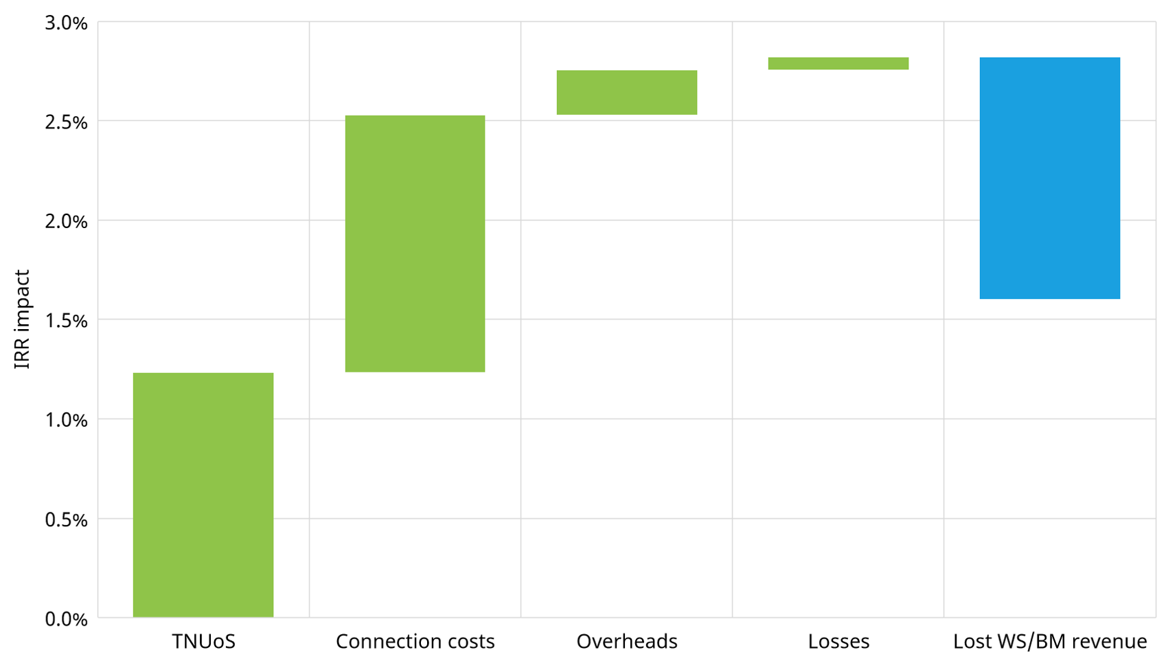Calculating the impact of co-location on IRR needs to be done on a case by case basis. Firstly, the impact on connection costs needs to be considered. If connection costs are high, this boosts IRR uplift from colocation.