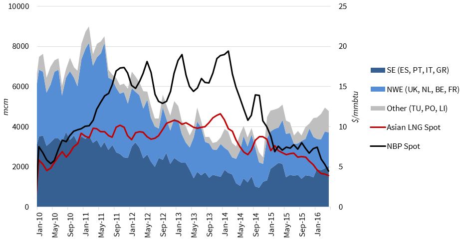 - Tight LNG market: Under conditions of global tightness, the European gas market diverts flexible LNG supply to meet shortfalls in Asia and other regions (e.g. post-Fukushima 2011-14)