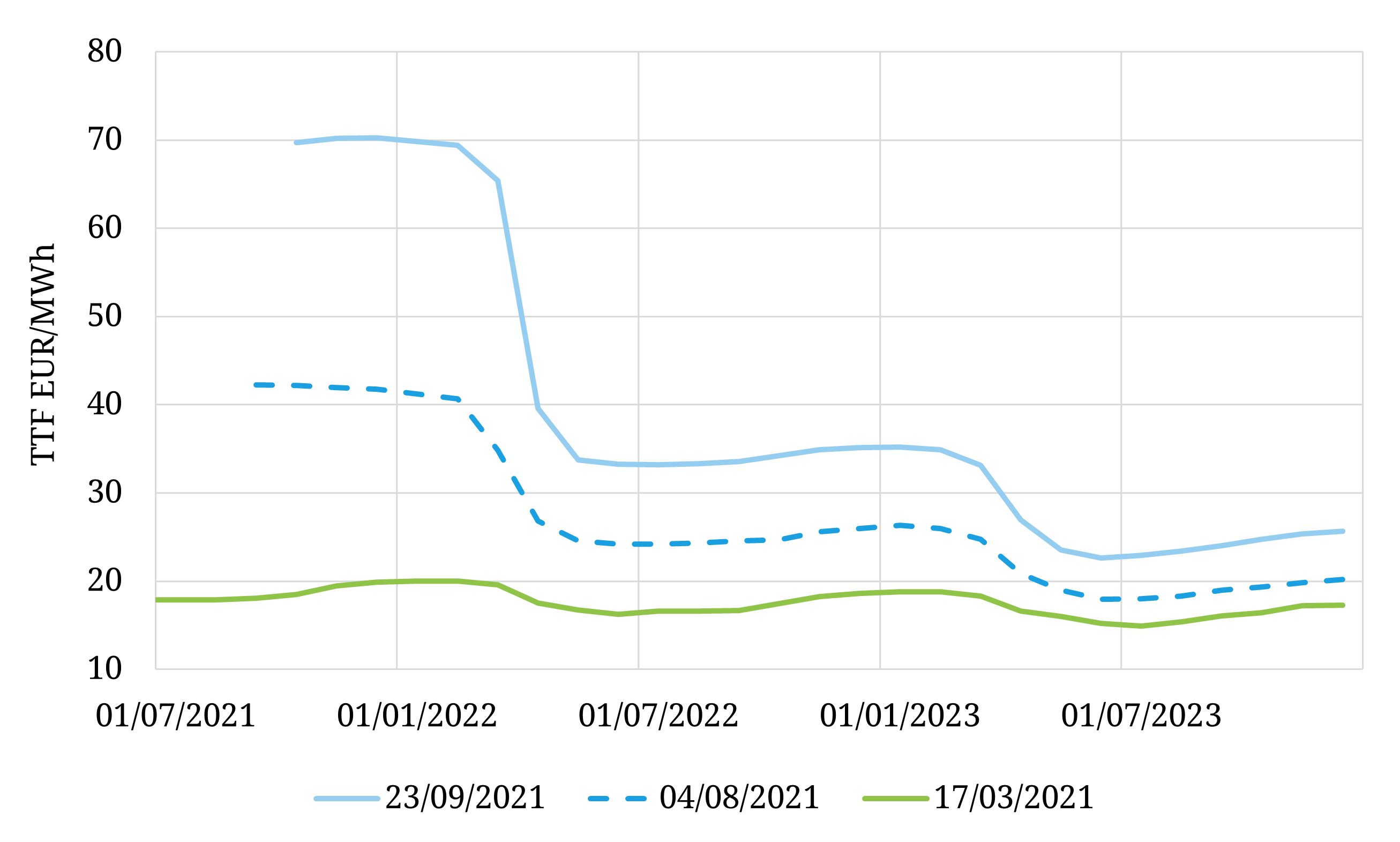 The result is illustrated by the explosion in the front of the TTF curve, from March (green line) to August (blue dashed line) and now to September (blue straight line).