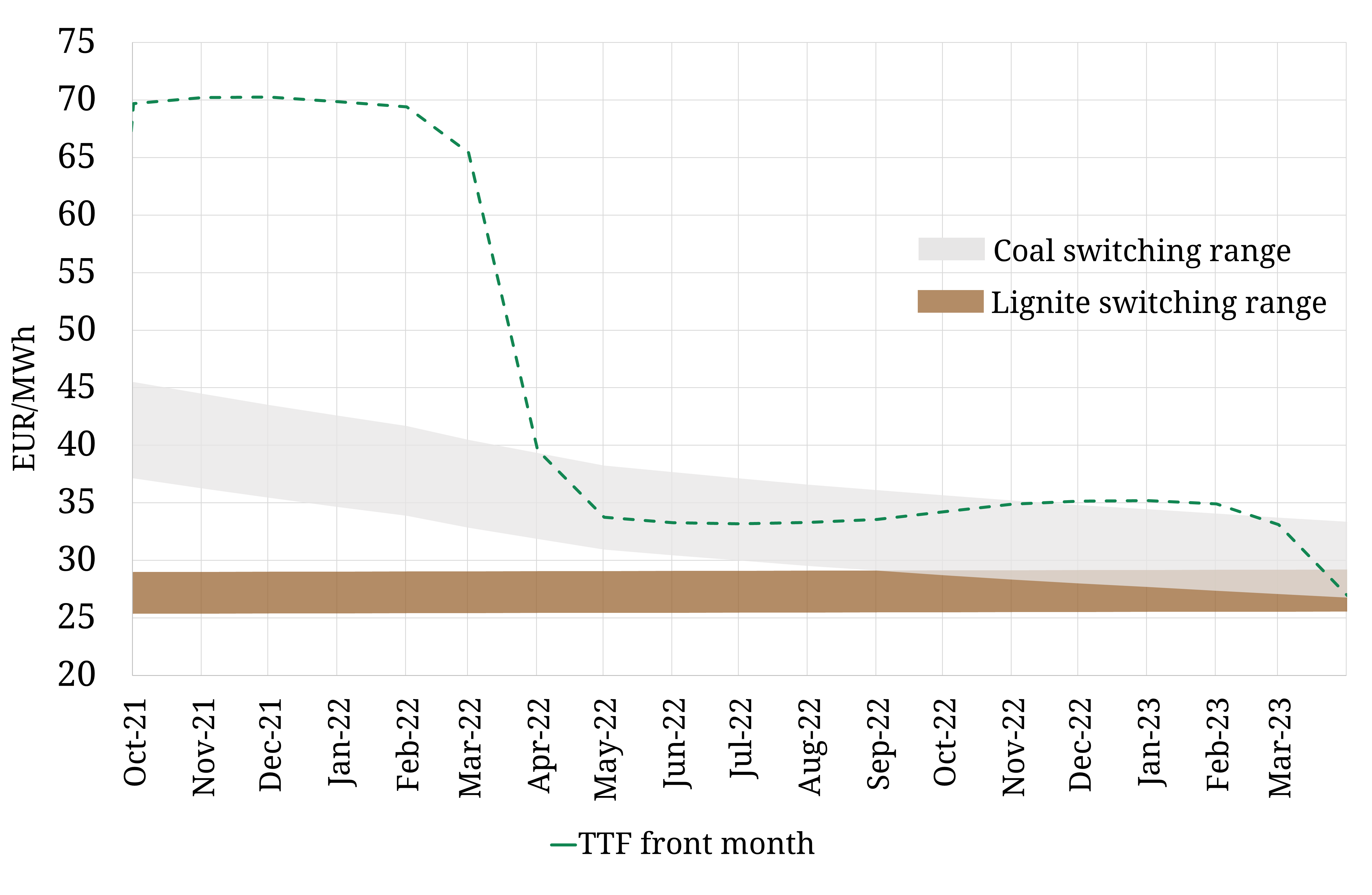 TTF prices in a 25-35 €/MWh range across 2022-23 may seem steep compared to recent history, but they are consistent with the pricing of coal as an alternative fuel in a tight energy market (accounting for the incremental cost of carbon).