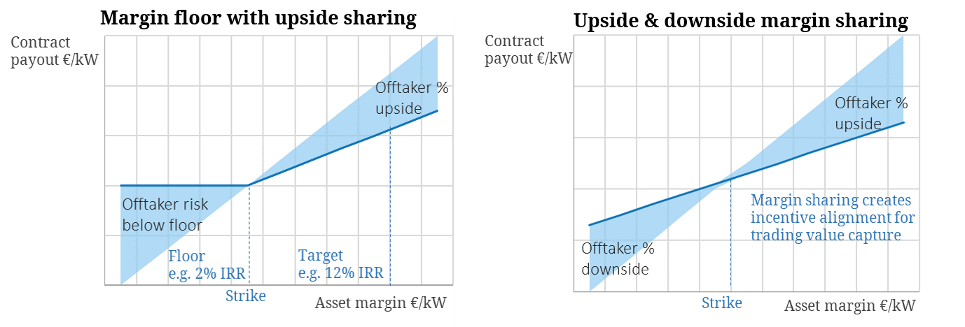 In the left hand panel, the offtaker is providing a margin floor to limit the investor’s downside market risk.  The floor (essentially a put option) is typically significantly out of the money, but can provide an infrastructure investor with important protection in terms of underpinning return of capital.  The cost of that floor usually consists of a fixed fee structure (e.g. monthly) and an upside sharing incentivisation mechanism, where the offtaker takes a defined percentage of realised returns.