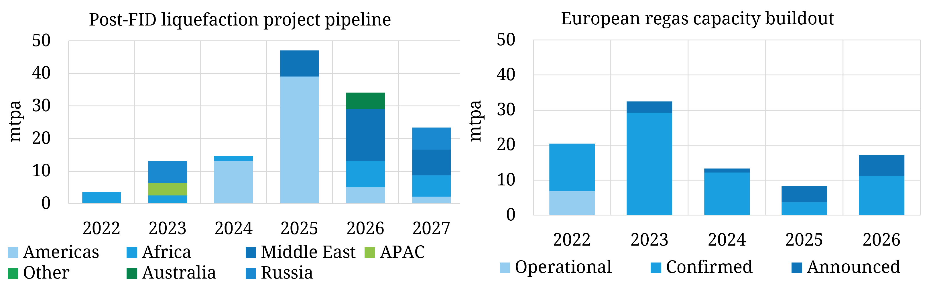Chart 1: Post-FID LNG supply (LH panel) & incremental European regas capacity (RH panel)