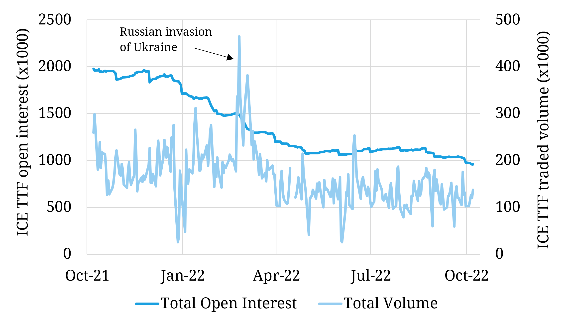 These conditions have driven a pronounced decline in liquidity across the European gas market & regional LNG markets. The fall in traded volumes and open interest since Q4 2021 for ICE’s TTF futures contract is illustrated in Chart 2.