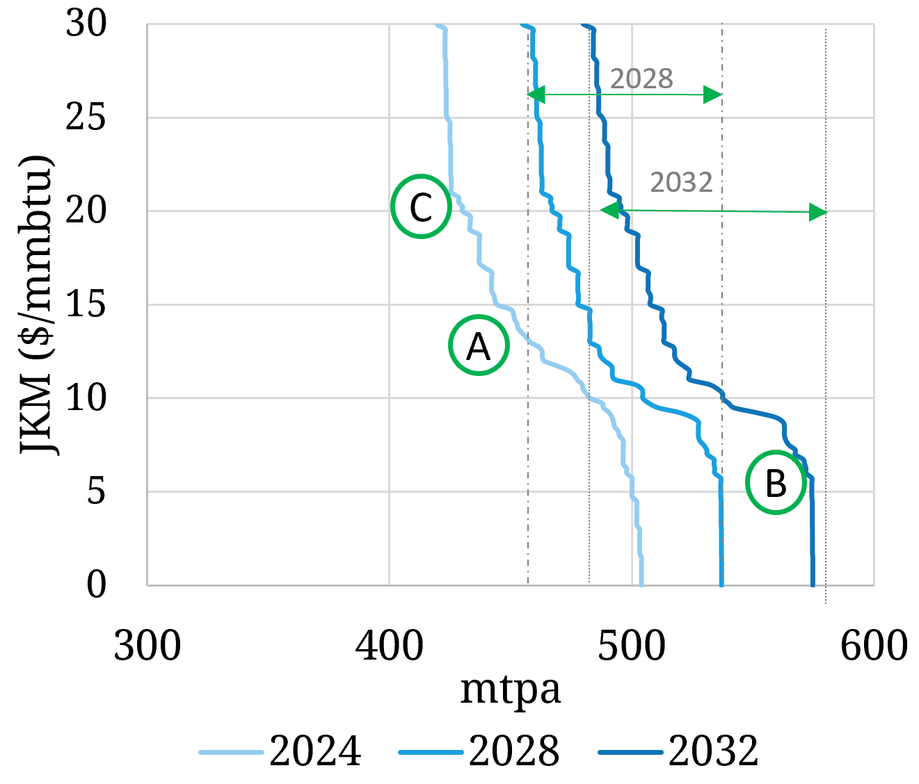 Let’s start with supply because it is a bit simpler than demand. Chart 1 shows a view of LNG market supply curve evolution in 4 year steps from 2024 to 2028 to 2032.