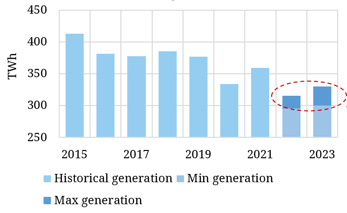 Pre-Covid, French nuclear fleet output ranged between 380 to 400 TWh. EDF guidance for 2022 output (295-315 TWh) is almost 100 TWh lower than normal. EDF is also now projecting little improvement into 2023 (300-330 TWh).