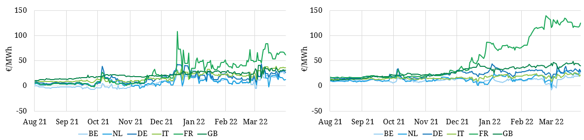 The close relationship between CSS began to break down from November last year as gas prices surged and concerns over French nuclear output began to increase. A sharp divergence in Summer 2022 French CSS can be seen in Dec 2021 when EDF announced issues with a number of reactors (left hand panel of Chart 2).