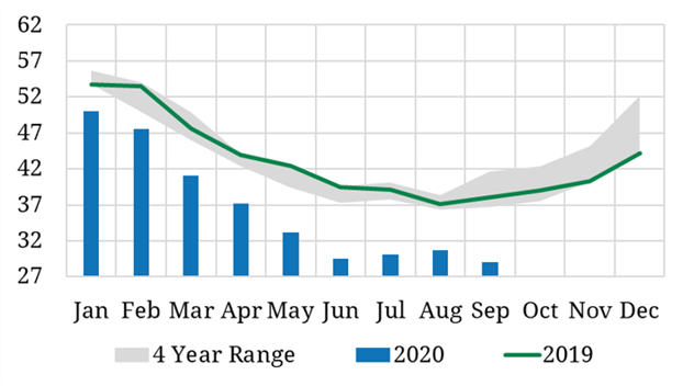 In theory, this winter should be OK. French nuclear output is scheduled to recover strongly in Q4 2020 as plants return from maintenance. European power demand remains at lower than normal levels, although the shortfall is declining steadily and now looks to have reduced to less than 5%. And hydro storage levels coming into the winter are relatively healthy.
