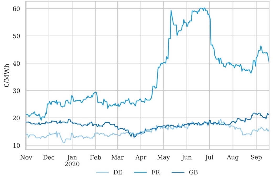 In contrast to Germany, UK spark spreads have continued their upward trend since July. This is consistent with the fact that the UK is becoming inherently more exposed to external shocks as the market loses thermal capacity and replaces it with intermittent renewable capacity and interconnectors.
