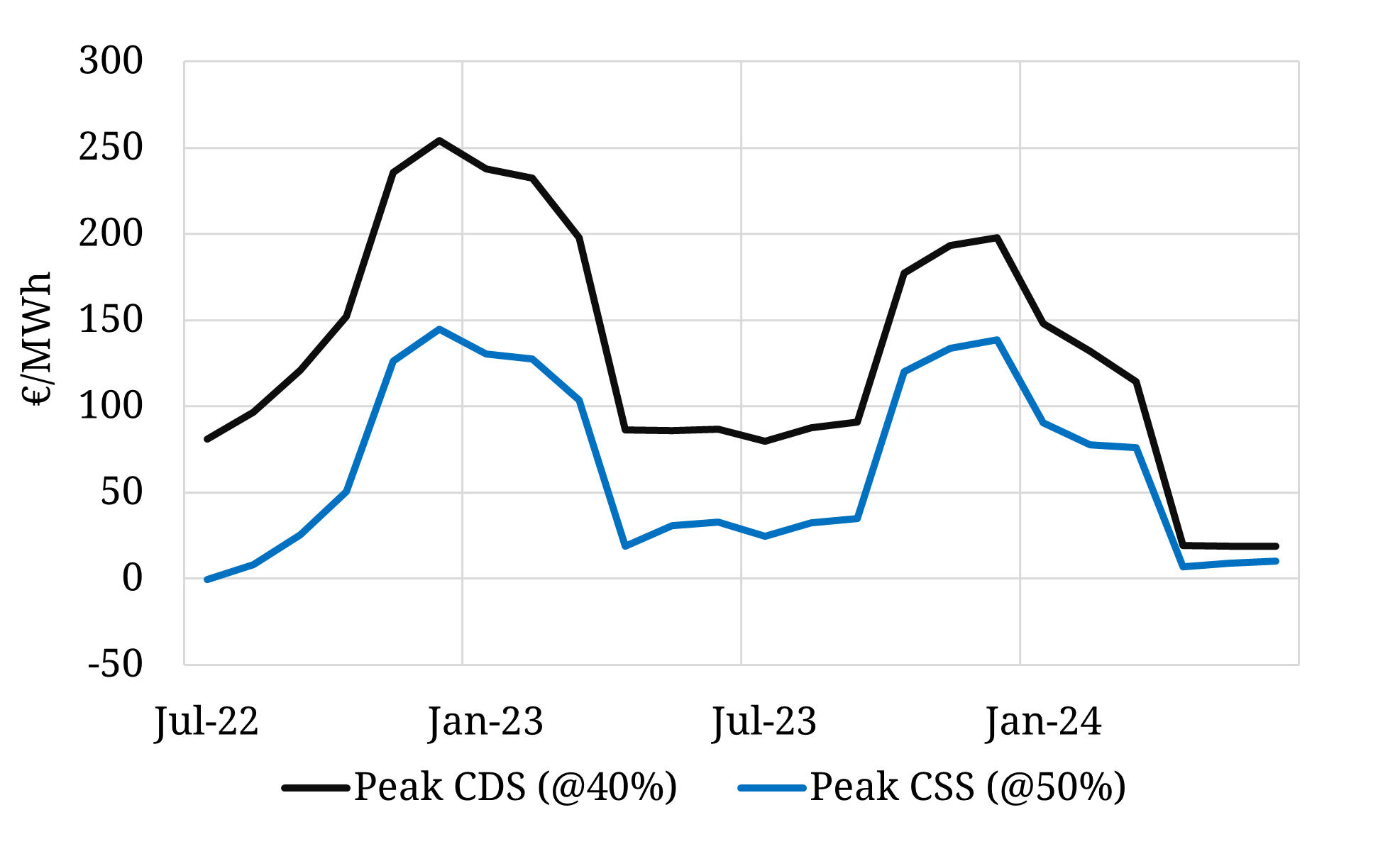 - Peak forward Clean Spark Spreads (CSS) a benchmark for CCGT generation margins across peak periods (blue line).
