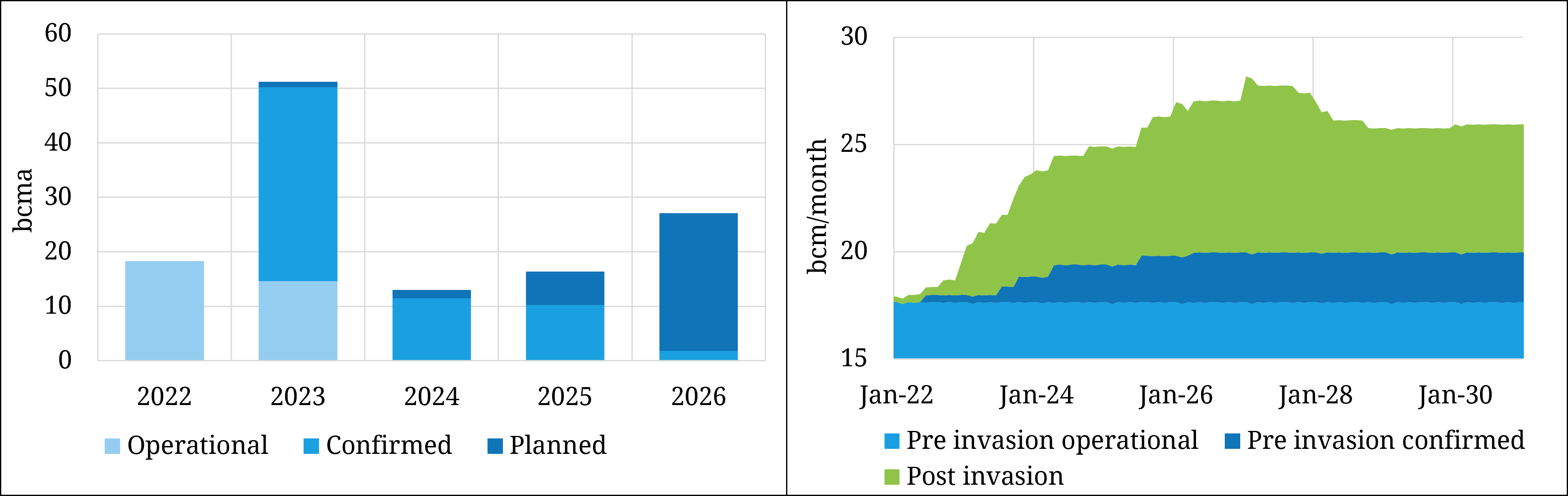 We project 123 bcm of confirmed new regas capacity. 100 bcm of this is classified as ‘post invasion’ expansion with the remaining 23bcm confirmed ‘pre-invasion’. The right-hand panel of chart shows the impact of this pretty breath-taking increase in regas capacity volume.