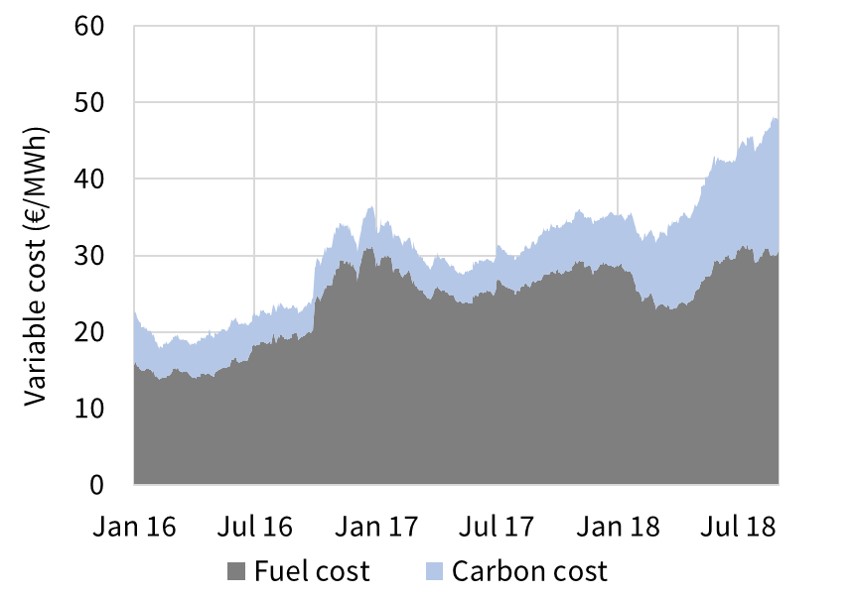 In 2018, the impact of a sharp move higher in gas hub prices on CCGT variable costs, has outweighed the impact of higher carbon prices on coal plant costs.  We explored the factors driving this move higher in gas prices in a recent article.