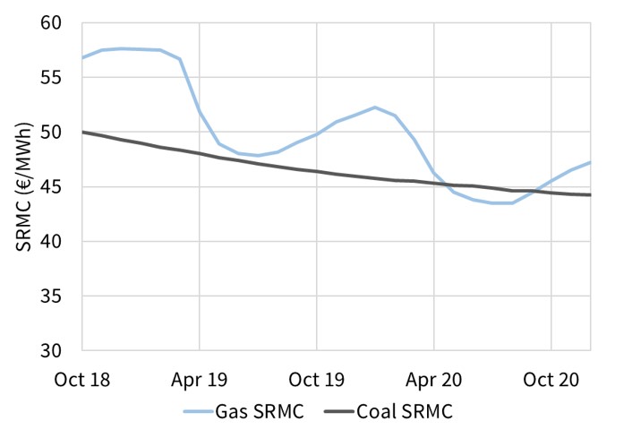 Chart 1 shows the evolution of the variable cost of an older German coal plant, split into carbon and fuel cost components. For simplicity variable O&M costs are not shown as they are relatively low (~ 1 €/MWh) and stable over time.