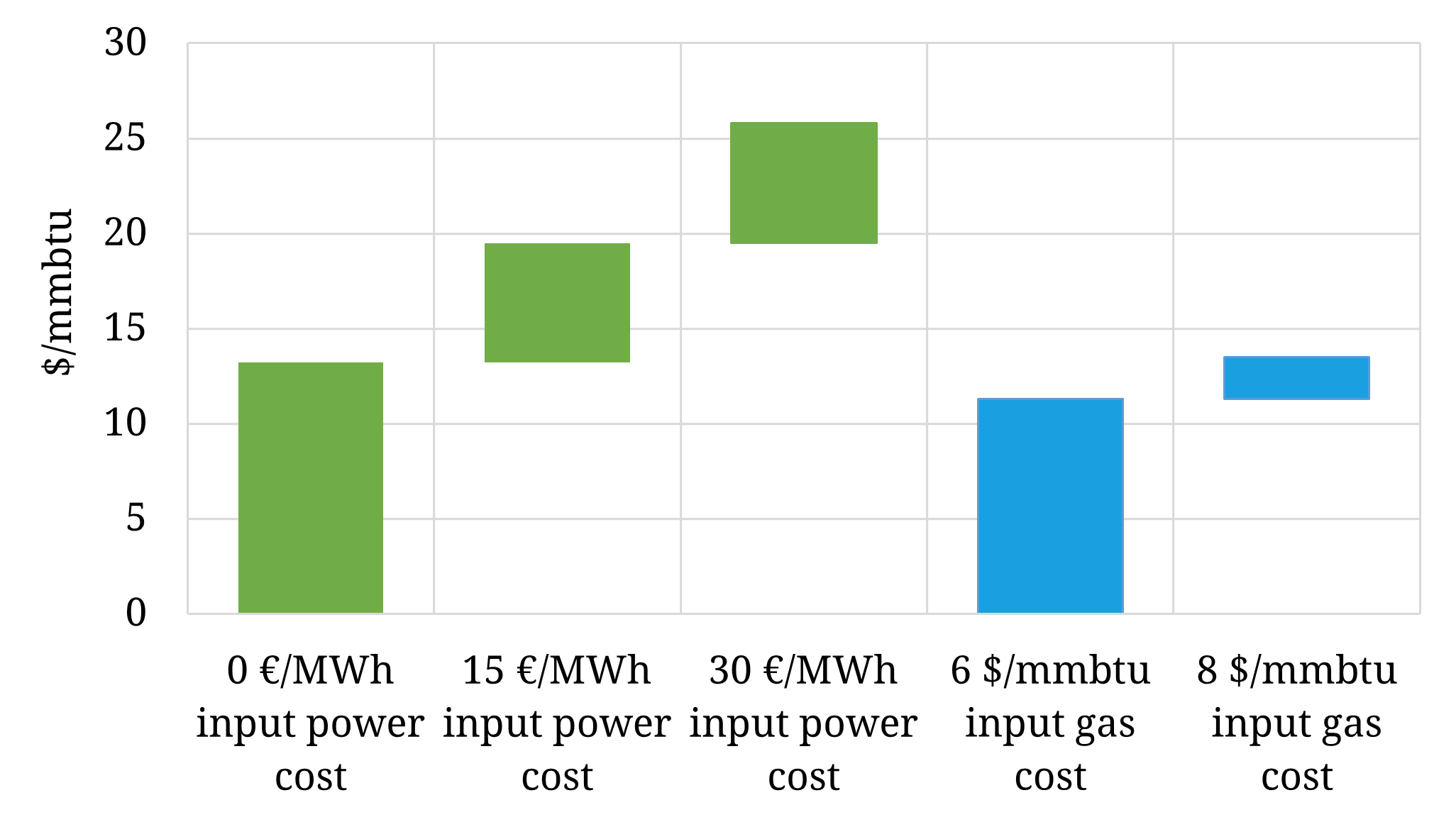 Chart 2 highlights how important input energy costs are for hydrogen economics, particularly power input costs for green hydrogen.
