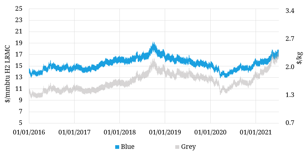 Chart 1: Grey vs blue hydrogen production cost fluctuations