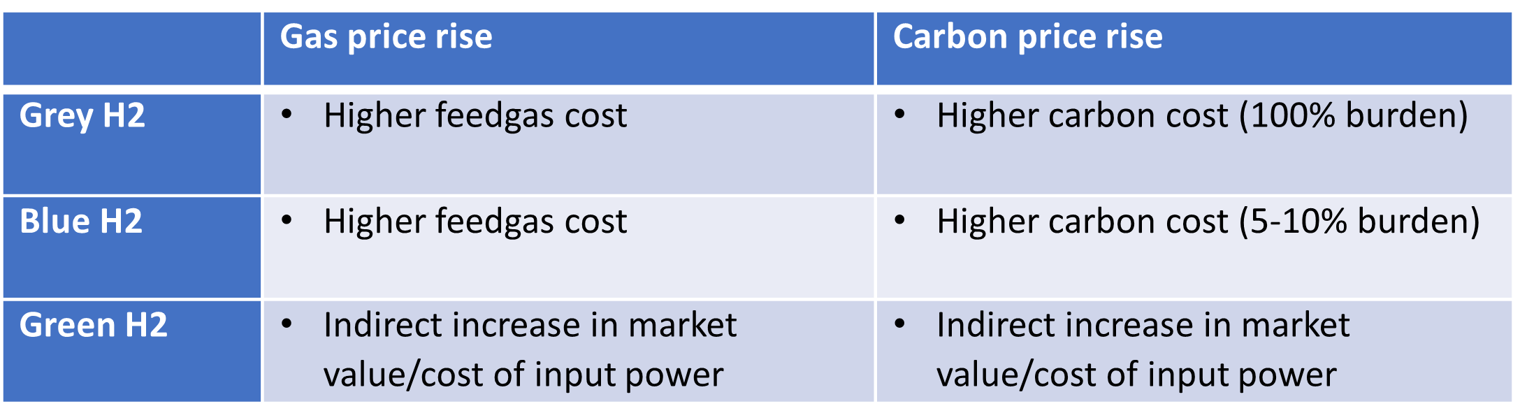 Hydrogen production involves converting one form of energy (gas or power) into another (hydrogen). As a result energy price moves have a major impact on both the relative and absolute long run economics of the 3 major types of hydrogen production as summarised in Table 1.