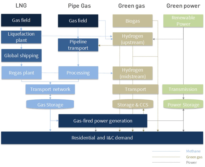 Methane is structurally embedded in the European energy mix. It is sourced from two main supply chains, pipeline supply and LNG, as shown in the blue boxes in Diagram 1.