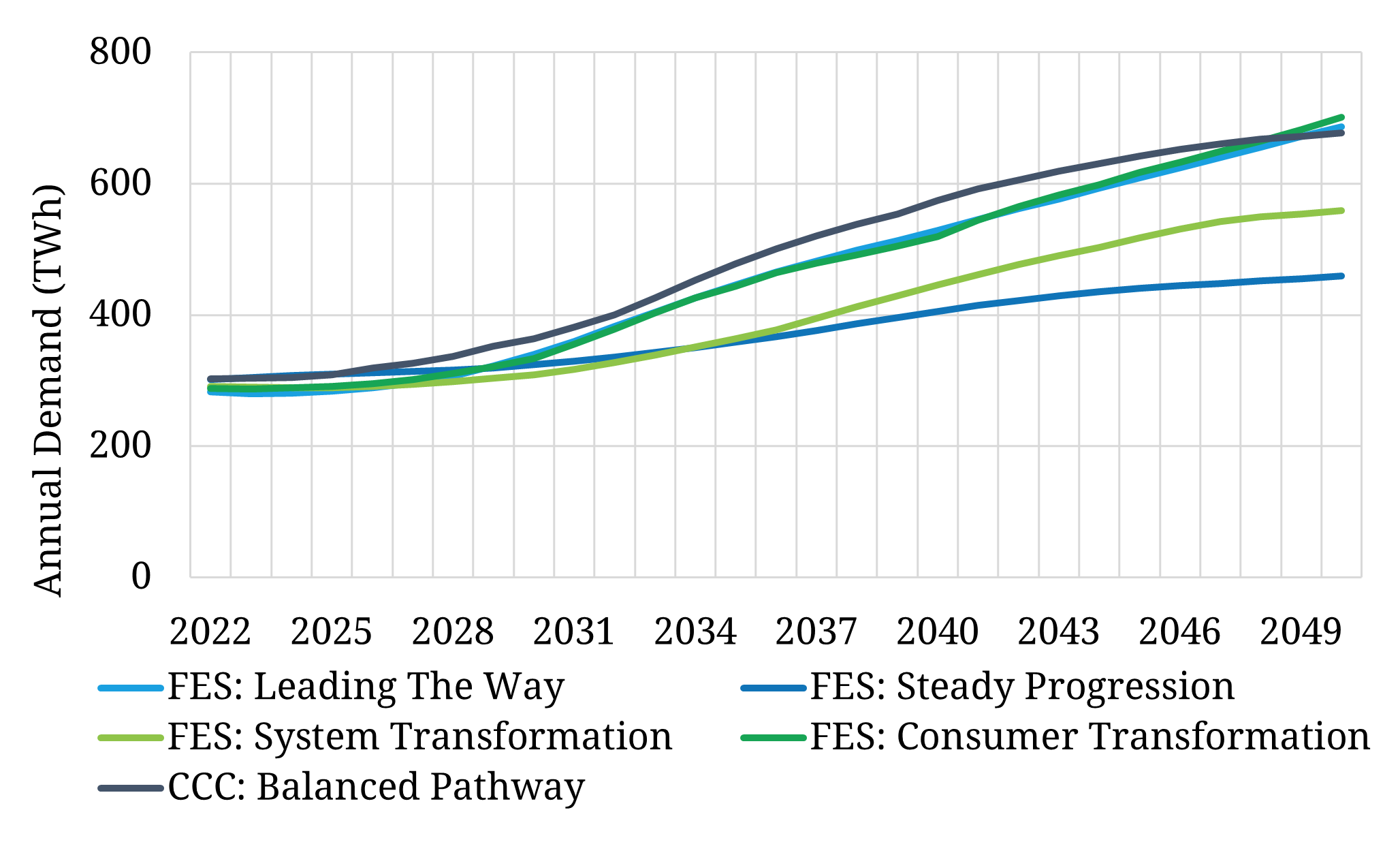 Chart 1 illustrates the scale of potential UK annual power demand growth. It shows the latest 4 Future Energy Scenarios (FES) published by National Grid (used for system planning purposes) as well as the Climate Change Committee (CCC) ‘Balanced Pathway’ to net zero by 2050.