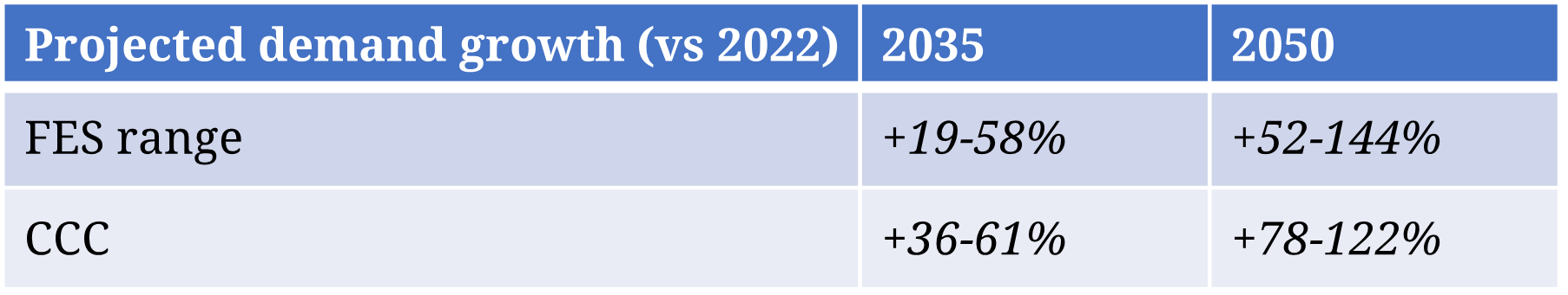 The table illustrates ranges of projected demand growth by 2035 and 2050. Even based on conservative estimates, demand is projected to be at least 25% higher by 2035. Demand may need to more than double by 2050 to achieve net zero targets.