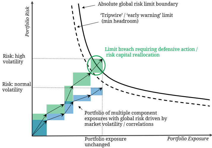 Chart 1 illustrates how portfolio exposure is built up via aggregation of component exposures, which sit within a risk limit boundary. A surge in market volatility acting on the same underlying exposures, acts to increase portfolio risk and can breach the risk limit boundary.
