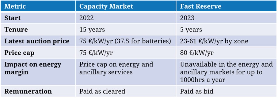 Participation in the Fast Reserve and Capacity Market auctions are mutually exclusive, and so investors must choose which route best underpins their battery investment case. Moreover, whilst both the Capacity Market & Fast Reserve are stackable with wholesale revenues, they impose different constraints on battery optimisation as summarised in Table 1.