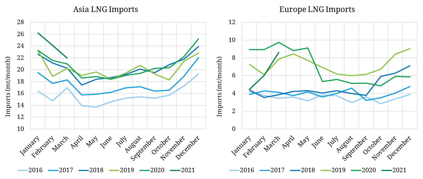 Chart 1: Asian & European LNG demand (2016-21)